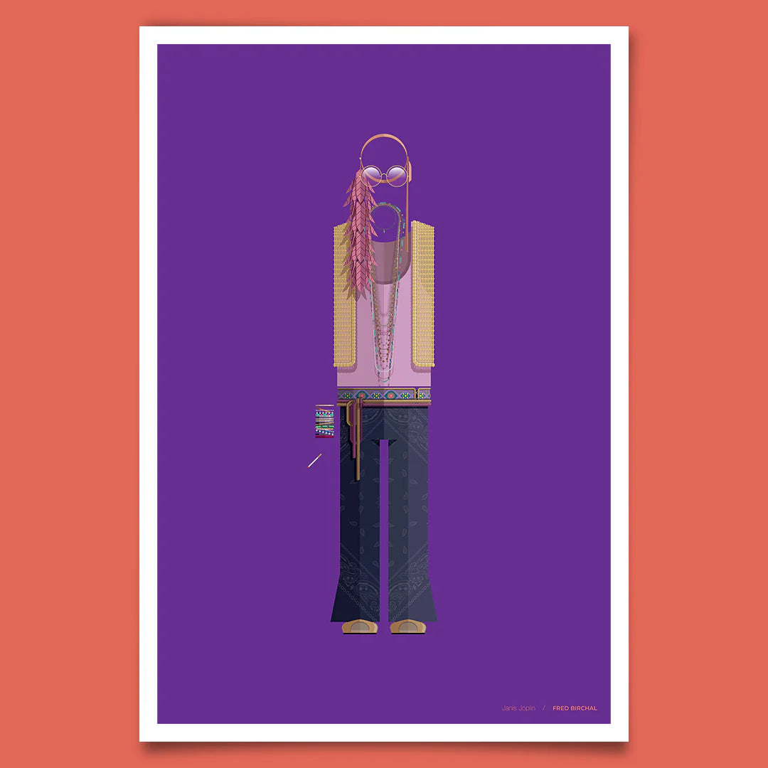 Janis Joplin, the iconic figure of the 1960s music scene, was known for her unique fashion sense, often wearing vibrant, loose, and unconventional clothing that perfectly reflected the counterculture of the time. This artwork highlights her free spirit and charismatic stage presence.