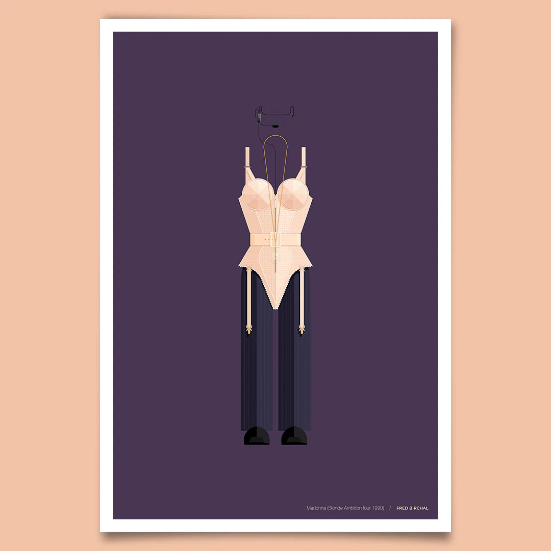 Inspired by Madonna's iconic cone bra designed by Jean Paul Gaultier, this poster captures the essence of a groundbreaking fashion moment in music history.